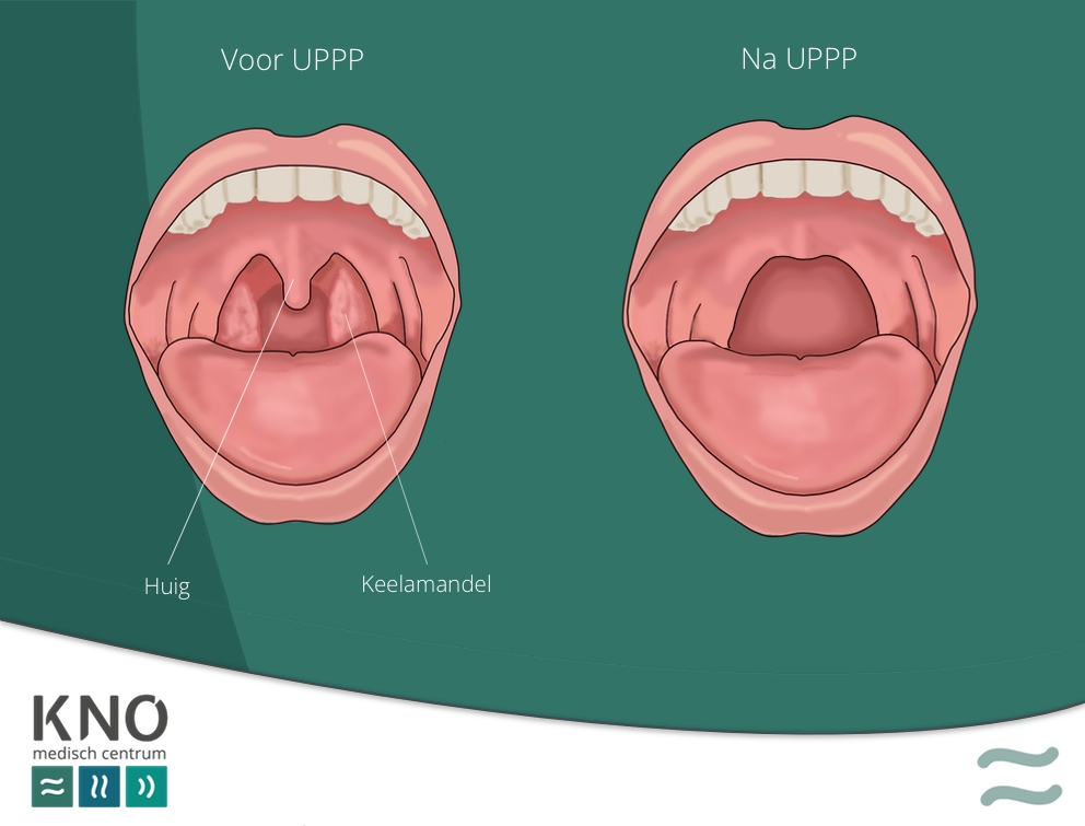 De operatie vindt plaats onder algehele narcose. Tijdens de operatie verwijdert de KNO-arts een klein stukje van het zachte gehemelte. Als de keelamandelen het snurken mede veroorzaken, verwijdert de arts deze ook. Meer informatie hierover krijgt u van uw KNO-arts. Bij een UPPP wordt de huig ook verwijderd. De huig heeft geen functie, dus u zult niet merken dat u deze mist. De huig is het aanhangsel van het zachte gehemelte. Het hangt midden tussen de keelamandelen.